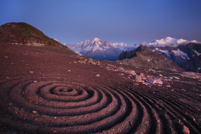 But today I was pulled out of my blogging rut when I saw these pictures of land art installations by artist Sylvain Meyer. I love land art, and Meyer’s pieces remind me an awful lot of the first artist I ever knew by name: Andy Goldsworthy. When I was in elementary school, I had a friend who came from a very cultured family. My family was incredibly science-oriented, which meant I spent almost zero time at art museums—but a lot of time visiting submarines, science exhibits and battle grounds. But when I was eight, I remember spending one sleepless night at my friends house, leafing through this giant coffee table book and wondering how long it would take for the sun to rise so I could go home. Goldsworthy got me through the night with his perfectly arranged rocks and woven windows of grass.