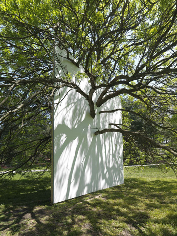 I like the idea that the piece takes the interior gallery wall, where you might see an image of nature on it, and instead places it in the tree itself where its flat plane and white wall sets off the amazing branches, leaves, and shadows created by the moving sunlight. I have created several pieces using drywall outdoors and it is surprisingly resilient. Plus I like that the drywall will succumb to the movement of the branches, and will deteriorate a bit over the duration of the show. The wall faces almost due west so from about 12:30 on the sun casts shadows on the wall from the tree limbs and leaves. This particular tree is fairly late to leaf out, so the piece will change considerably throughout the season.