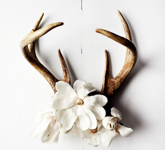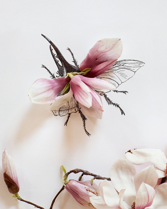 Artist Kari Herer creates weird and beautiful prints that mix both materials and species in a minimalist mash-up that I adore. Flora and fauna come together in her photography. Using live blossoms and her static sketches, Herer makes bugs out of magnolia petals, foxes out of lush, overripe roses. Some of her pieces look like a Flemish still life—vivid and colorful, bursting with excess. However, others are almost self-consciously O’Keeffe-ian, like the antlered bouquet below.
